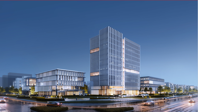景观设计: 通过丰富的空间体系与景观搭配,开放式绿轴设计围合办公楼栋,以低密绿化、开阔楼间距、独栋设计等打造绿色生态示范园区;