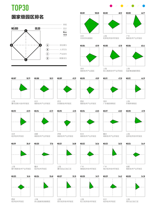 《产业园区魅力排行榜》的评价体系由4个一级指标、10个二级指标和35个三级指标构成。4个一级指标分别为区位潜力、人才引力、产业动力与配套活力。其中,极光iZone、智联招聘和量子数聚为榜单提供了人口、招聘、企业等一系列园区层面衡量产业发展的大数据。