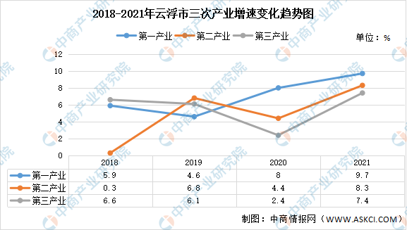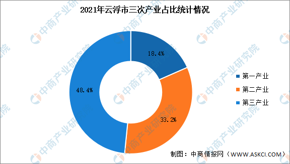 根据广东省地区生产总值统一核算结果,2021年全年云浮市地区生产总值为1138.97亿元,同比增长8.1%,两年平均增长6.1%。其中,第一产业增加值为209.96亿元,同比增长9.7%,两年平均增长8.9%;第二产业增加值为377.90亿元,同比增长8.3%,两年平均增长6.3%;第三产业增加值为551.11亿元,同比增长7.4%,两年平均增长4.9%。三次产业结构比重为18.4:33.2:48.4。