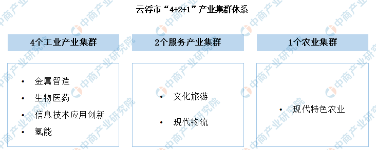 云浮市聚力打造战略性产业集群,培育壮大新经济增长点,以“4+2+1”产业集群体系促进三次产业优化升级,不断提升产业综合竞争力。云浮市发展壮大金属智造、生物医药、信息技术应用创新、氢能等4个工业产业集群,文化旅游、现代物流等2个服务产业集群及1个现代特色农业。