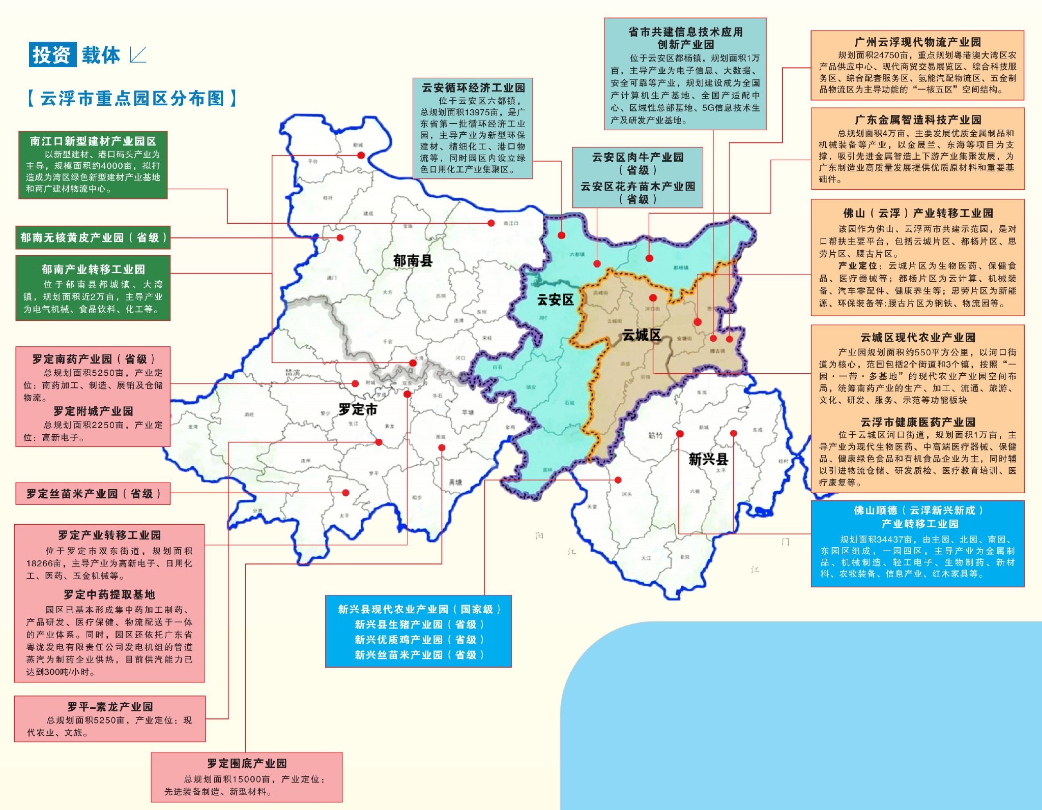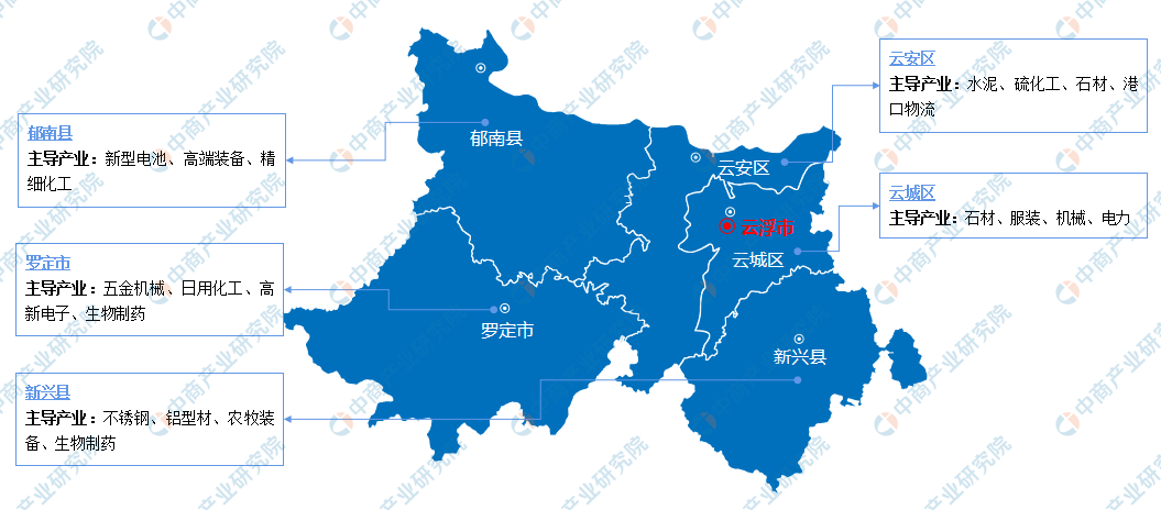 云浮市辖2区2县1市,包括云城区、云安区、罗定市、新兴县和郁南县。云浮市传统优势产业有水泥、不锈钢制品、硫化工、石材、电力。目前,重点主导招商产业有金属制造、氢能源、信息技术、生物医药、文化旅游、现代农业及现代物流。