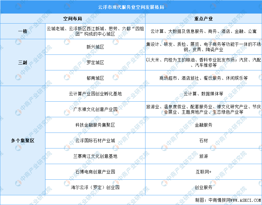 云浮市形成“一核(中心城区)引领、三副(新兴、罗定、郁南)联动、多个集聚区拓展”的空间发展格局,整体推进云浮市服务业发展要素资源优化配置。
