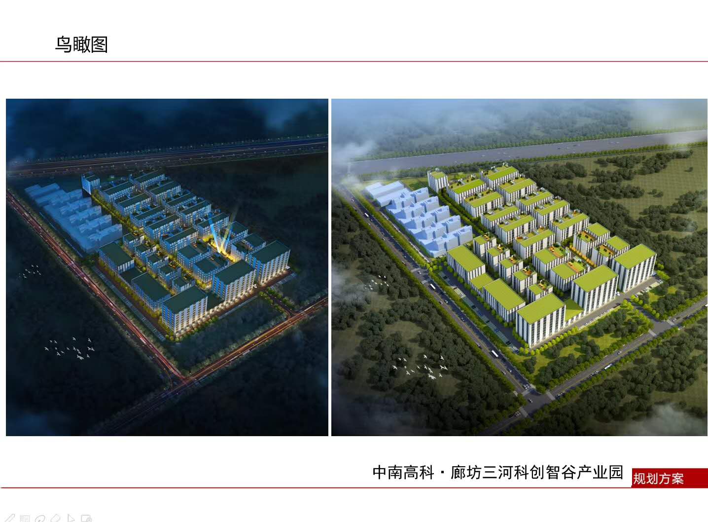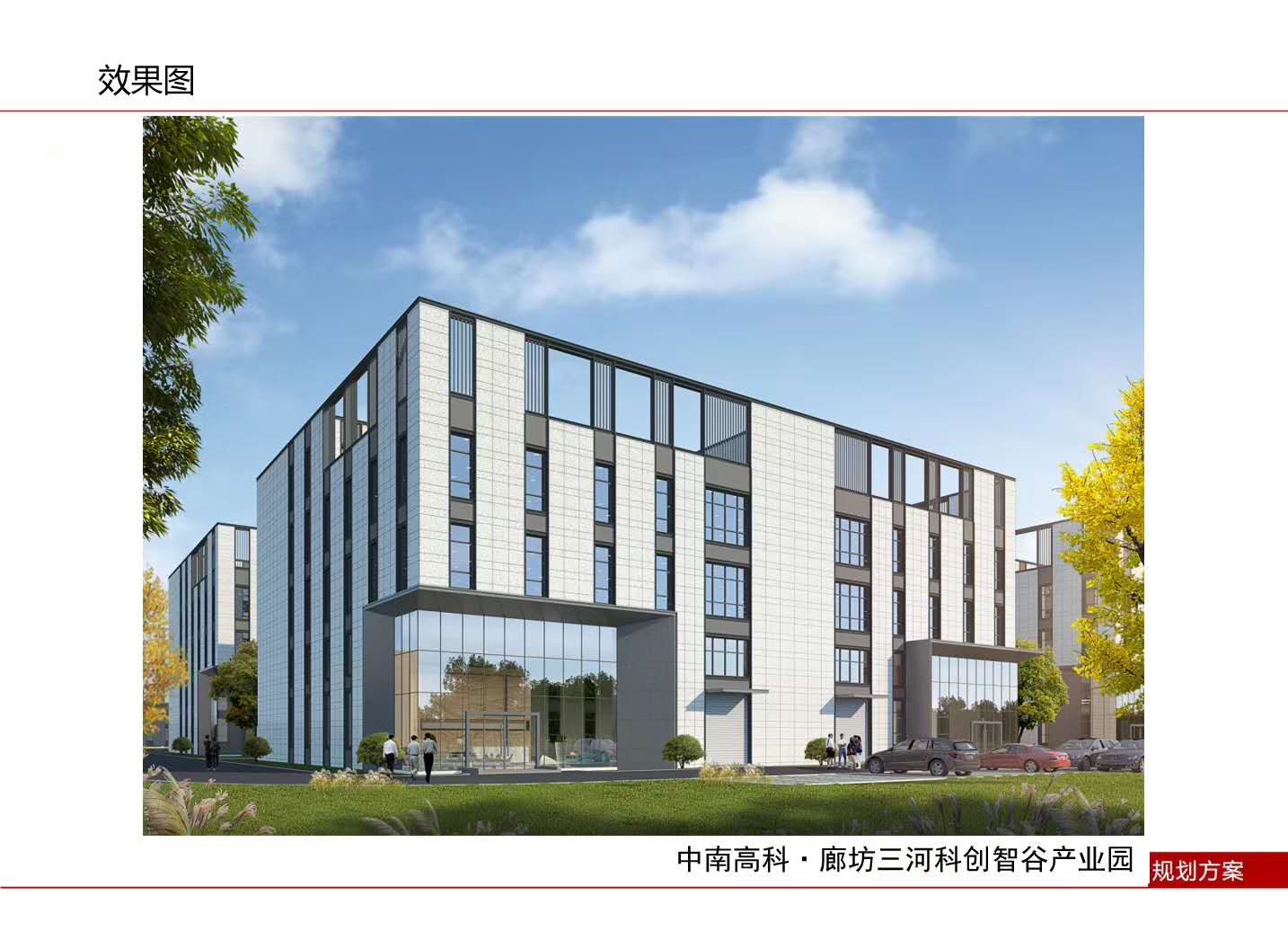 【规划】中南高科燕郊科创智谷产业园,占地面积96亩,分为三期。土地已摘牌,土地性质是国有50年大产权工业用地,规划建筑面积约为13万平方米,均为框架产品,户型3.5层、4.5层、5层、9层四类产品。
