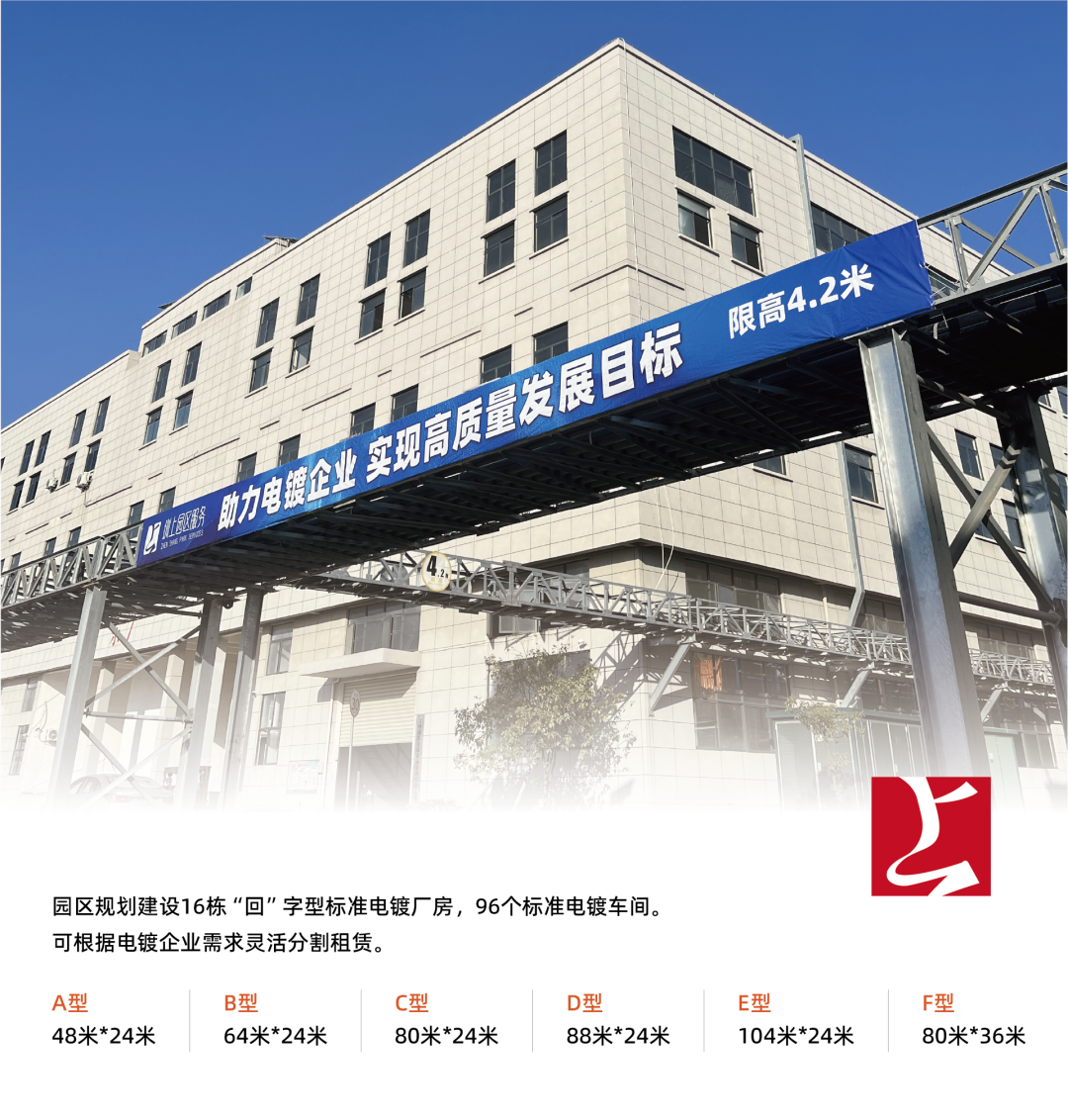 厂房规格多样,最大104*24米,标准80*24米,最小48*24米。均为三层结构,每层配有独立货运电梯。园区预计可容纳百家表面处理企业,涵盖各类镀种。