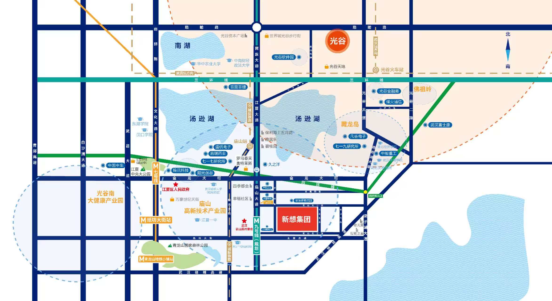 新想集团·江夏智能制造产业园,位于武汉市江夏区庙山开发区花山五路六号(庙山大道与花山北二路交汇处旁),大光谷创新组团—江夏经开区庙山高新技术产业园,汤逊湖畔、北靠光谷,具有集聚光谷创新智造产业链配套,承接科技型企业生产制造转移等功能。