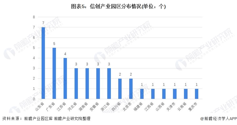 目前我国信创产业园共有38个,其中山东省省信创产业园分布数量最多,达到7个,其次为广东省省,其产业园数量达到5个。