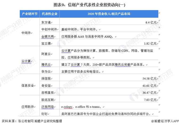 由于信创产业囊括细分行业较多,全产业链布局公司较少,产业链中上市公司较少。我国信创产业链中不同产业链环节中相关代表企业行业产品布局/营收如下: