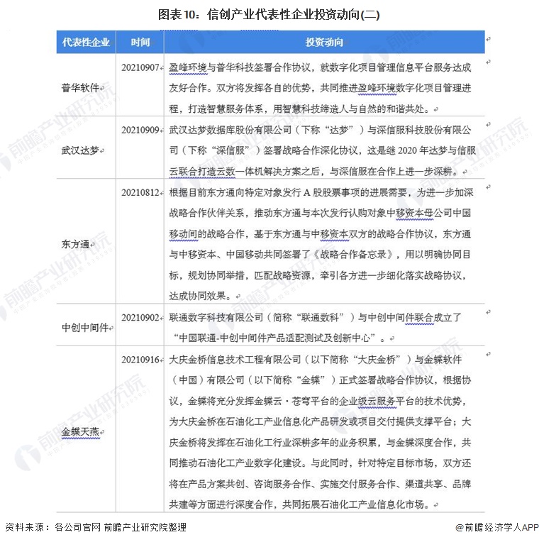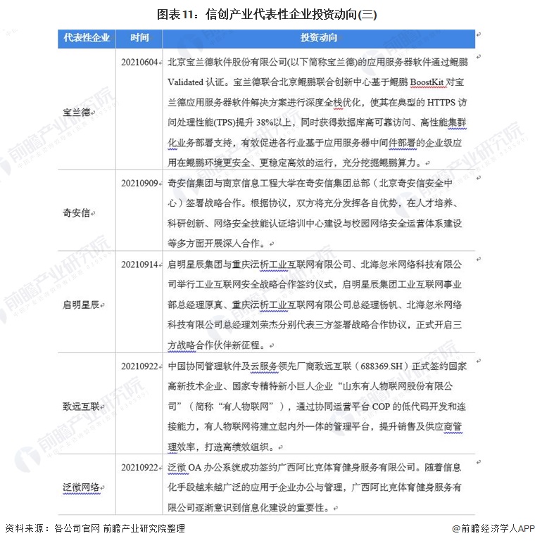 从各代表公司投资动向来看,信创产业各大公司在投资领域倾向于企业之间战略合作,以实现“1+1>2”的协同发展。除此之外,信创相关企业还会与实验室、大学等建立合作关系,从而提高公司的科研能力。详细投资动向如下: