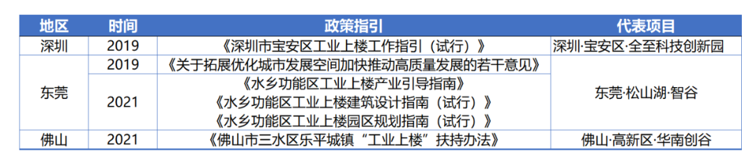 随后,东莞、佛山等珠三角地区纷纷开启工业上楼的实践探索,如广东省政府提出推进工业上楼,将“工业上楼”作为提升工业空间、夯实先进制造业根基的重要举措;深圳宝安区制定工业上楼工作指引;东莞出台《关于拓展优化城市发展空间加快推动高质量发展的若干意见》,提出“开发建设高标准厂房和工业大厦”等。